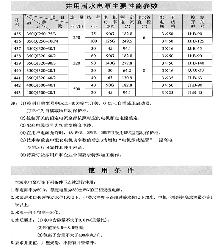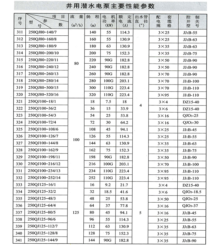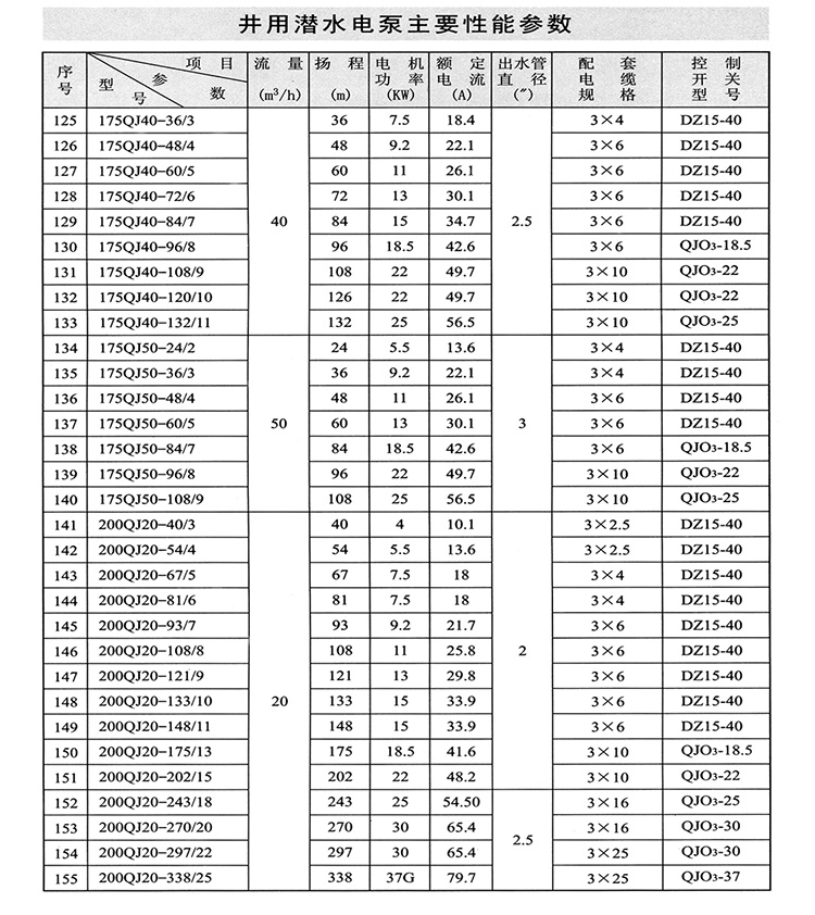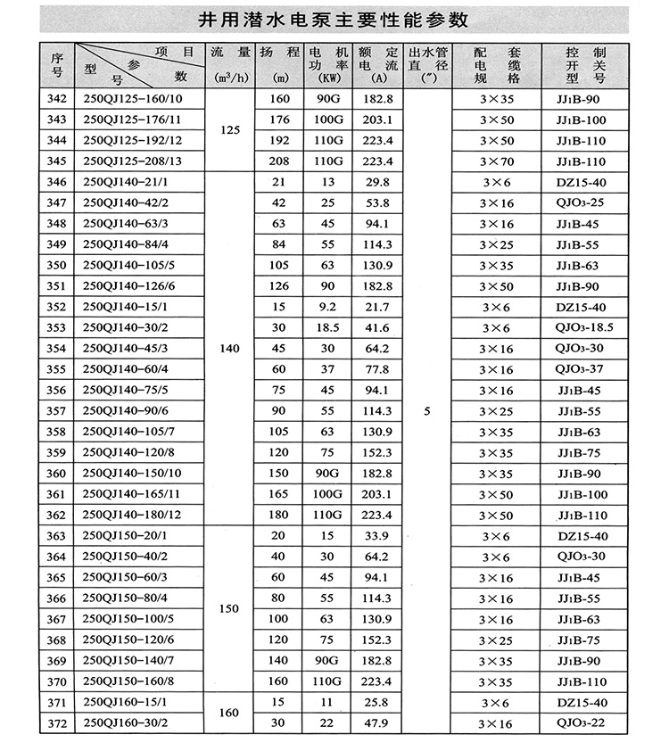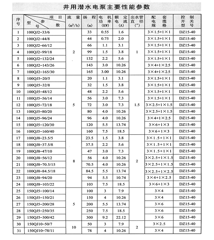 結(jié)構(gòu)說(shuō)明 1.QJ型潛水電泵機(jī)組由:水泵、潛水電機(jī)(包括電纜)、輸水管和控制開(kāi)關(guān)四大部分組成。潛水泵為單吸多級(jí)立式離心泵:潛水電機(jī)為密閉充水濕式、立式三相鼠籠異歩電動(dòng)機(jī),電機(jī)與水泵通過(guò)爪式或中.鍵筒式聯(lián)軸器直接;配備有不同規(guī)格的三芯電纜:起動(dòng)設(shè)備為不同容量等級(jí)的空氣開(kāi)關(guān)和自耦減壓起動(dòng)器、輸水管為不同直徑的鋼管制成,采用法蘭聯(lián)接,高揚(yáng)程電泵釆用閘閥控制。 2.潛水泵每級(jí)導(dǎo)流殼中裝有一個(gè)橡膠軸承;葉輪用錐形套固定在泵軸上:導(dǎo)流殼采用嫘紋或螺栓聯(lián)成一體。 3.高揚(yáng)程潛水泵上部裝有止回閥,避免停機(jī)水錘造成機(jī)組破壞。 4.潛水電機(jī)軸上部裝有迷宮式防砂器和兩個(gè)反向裝配的骨架油封,防止流砂進(jìn)入電機(jī)。 5.潛水電機(jī)采用水潤(rùn)滑軸承,下部裝有橡膠調(diào)壓膜、調(diào)壓彈簧,組成調(diào)壓室,調(diào)節(jié)由于溫度引起的壓力變化;電機(jī)繞組采用聚乙烯絕緣,尼龍護(hù)套耐水電磁線,電纜聯(lián)接方式按QJ型電纜接頭工藝, 把接頭絕緣脫去刮凈漆層,分別接好,焊接牢固,用生橡膠繞-層。再用防水粘膠帶纏2~3層,外面包上2〜3層防水膠布或用水膠粘結(jié)包一層橡膠帶(自行車?yán)锾ァ狄苑罎B水。 6.電機(jī)密閉,采用精密止口螺牷,電纜出口加膠塾進(jìn)行密封。 7.電機(jī)上端有一個(gè)注水孔,有一個(gè)放氣孔,卜部打個(gè)放水孔。 8.電機(jī)下部裝有上卜—止推軸承,止推軸承上有溝槽用干冷卻,和它對(duì)磨的是不銹鋼推力盤,承愛(ài)水泵的上廠軸向力。