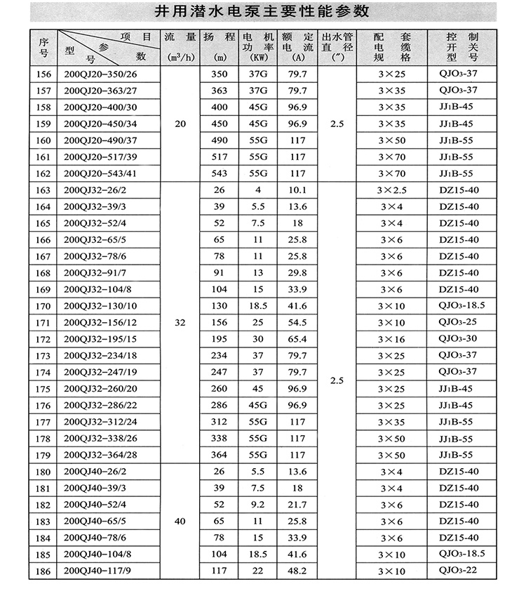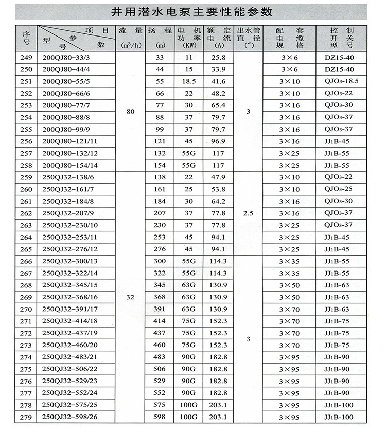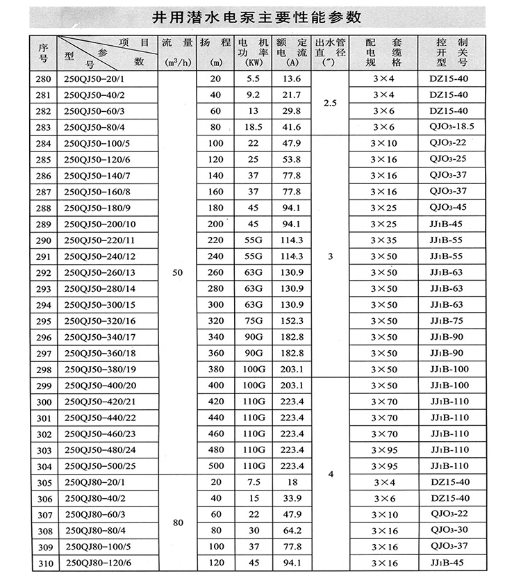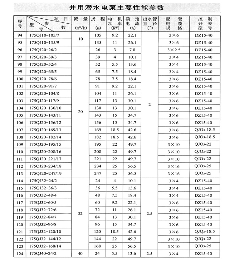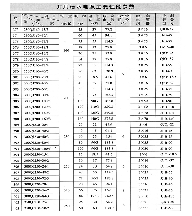 結(jié)構(gòu)說(shuō)明 1.QJ型潛水電泵機(jī)組由:水泵、潛水電機(jī)(包括電纜)、輸水管和控制開(kāi)關(guān)四大部分組成。潛水泵為單吸多級(jí)立式離心泵:潛水電機(jī)為密閉充水濕式、立式三相鼠籠異歩電動(dòng)機(jī),電機(jī)與水泵通過(guò)爪式或中.鍵筒式聯(lián)軸器直接;配備有不同規(guī)格的三芯電纜:起動(dòng)設(shè)備為不同容量等級(jí)的空氣開(kāi)關(guān)和自耦減壓起動(dòng)器、輸水管為不同直徑的鋼管制成,采用法蘭聯(lián)接,高揚(yáng)程電泵釆用閘閥控制。 2.潛水泵每級(jí)導(dǎo)流殼中裝有一個(gè)橡膠軸承;葉輪用錐形套固定在泵軸上:導(dǎo)流殼采用嫘紋或螺栓聯(lián)成一體。 3.高揚(yáng)程潛水泵上部裝有止回閥,避免停機(jī)水錘造成機(jī)組破壞。 4.潛水電機(jī)軸上部裝有迷宮式防砂器和兩個(gè)反向裝配的骨架油封,防止流砂進(jìn)入電機(jī)。 5.潛水電機(jī)采用水潤(rùn)滑軸承,下部裝有橡膠調(diào)壓膜、調(diào)壓彈簧,組成調(diào)壓室,調(diào)節(jié)由于溫度引起的壓力變化;電機(jī)繞組采用聚乙烯絕緣,尼龍護(hù)套耐水電磁線,電纜聯(lián)接方式按QJ型電纜接頭工藝, 把接頭絕緣脫去刮凈漆層,分別接好,焊接牢固,用生橡膠繞-層。再用防水粘膠帶纏2~3層,外面包上2〜3層防水膠布或用水膠粘結(jié)包一層橡膠帶(自行車?yán)锾ァ狄苑罎B水。 6.電機(jī)密閉,采用精密止口螺牷,電纜出口加膠塾進(jìn)行密封。 7.電機(jī)上端有一個(gè)注水孔,有一個(gè)放氣孔,卜部打個(gè)放水孔。 8.電機(jī)下部裝有上卜—止推軸承,止推軸承上有溝槽用干冷卻,和它對(duì)磨的是不銹鋼推力盤,承愛(ài)水泵的上廠軸向力。
