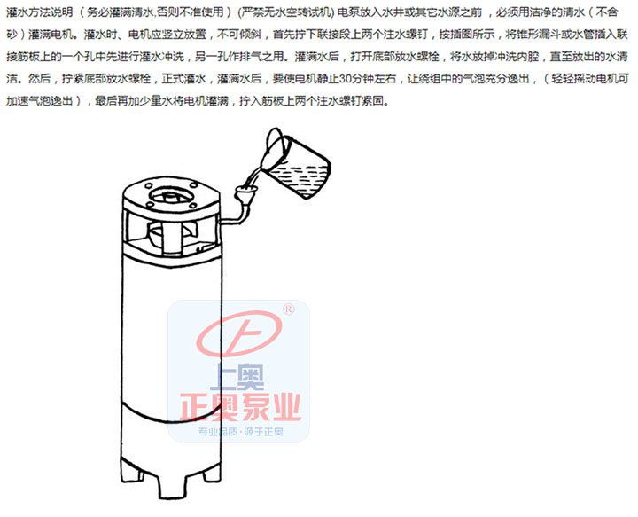 切記電機(jī)下井前必須注滿清水,擰緊注水,放氣螺塞,否則不準(zhǔn)使用。