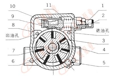 1、護(hù)罩    2、調(diào)節(jié)螺釘  3、葉  片    4、轉(zhuǎn)    子   5、螺堵  6、板彈簧   7、  軸    8、泵    體   9、閥  芯    10、閥    座   11、彈  簧