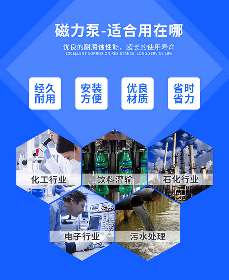 磁力泵結(jié)構(gòu)緊湊、外形美觀、體積小、噪音低、運(yùn)行可靠、使用維修方便。可廣泛應(yīng)用于化工、制藥、石油、電鍍、食品、電-影照相洗印、科研機(jī)構(gòu)、國(guó)防工業(yè)等單位抽送酸、堿液、油類、稀有貴重液、毒液、揮發(fā)性液體,以及循環(huán)水設(shè)備配套、過(guò)濾機(jī)配套。特別是漏、易燃、易爆液體的抽送,選用此泵則更為理想。