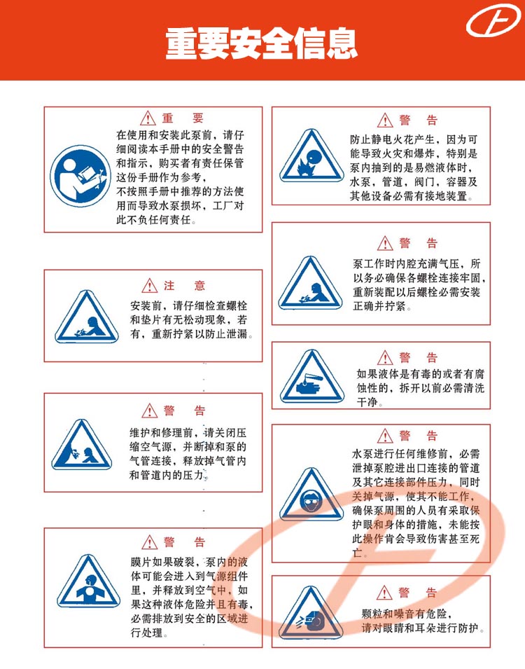 正奧公司目前已形成系列化生產(chǎn),共有八種規(guī)格直徑:φ10mm(3/8')φ15mm(1/2')、φ25mm(1')、φ40mm(11/2')、φ50mm(2')、φ65mm(21/2')、φ80mm(3')、φ100mm(4')。五種材質(zhì):鋁合金、鑄鐵、不銹鋼、工程塑料、襯里(襯膠隔膜泵,襯氟隔膜泵)。隔膜泵根據(jù)不同液體介質(zhì)分別采用丁晴橡膠、氯丁橡膠、氟橡膠、聚四氟乙烯隔膜。以滿足不同用戶的需要。