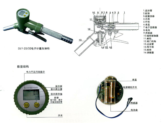 1、進油管2、膠墊3、孔板整流器4、芯架5、葉輪6、表蓋7、電子顯數器8、電池9、傳感器10、磁性聯軸器11、蝸輪12、閥門機構13、出油管14、彎手柄15、槍體16、調整器