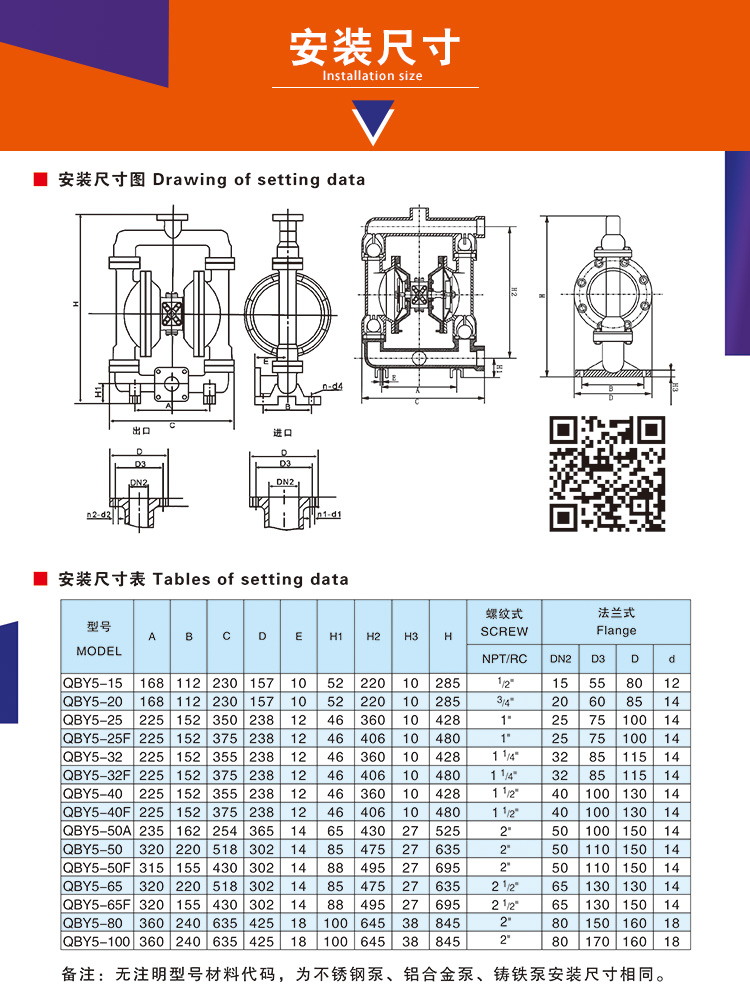 正奧公司生產(chǎn)的隔膜泵共有十二種規(guī)格。進(jìn)出口尺寸分別為1/4”(10mm)、1/2”(15mm)、3/4”(20mm)、1”(25mm)、1.2”(32mm)1.5”(40mm)、2”(50mm)、2.5”(65mm)3”(80mm)、4”(100mm)流體部件材質(zhì)有:鋁合金、鑄鐵、工程塑料、不銹鋼、隔膜片根據(jù)不同膜片材質(zhì)分別有:丁晴橡膠、氯丁橡膠、聚乙烯、聚膠、聚醚橡膠、氟橡膠、氟塑料、特氟隆。以滿足不同液體介質(zhì)的需要。