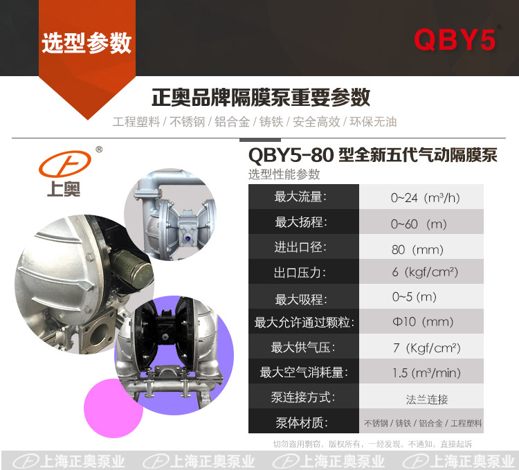 QBY5-80F型塑料氣動隔膜泵是我公司開發(fā)的第五代氣動隔膜泵,QBY5型正奧氣動隔膜泵是上海正奧泵業(yè)有限公司氣動隔膜泵的外形進一步改進,機械外觀更美;不卡機,無油氣動隔膜泵。